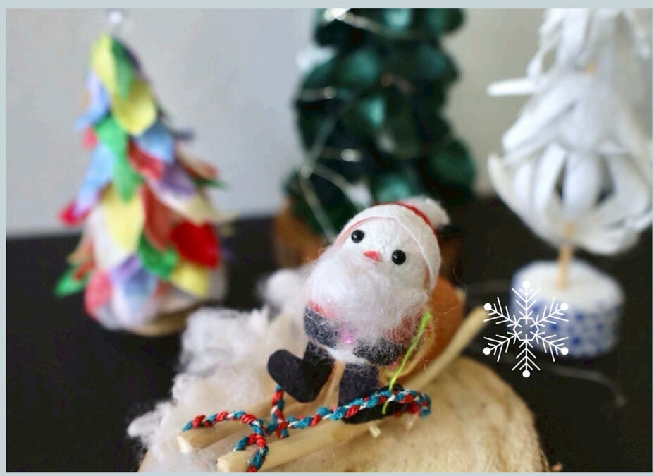 今回はまゆを使って「クリスマスのまゆ工作」。繭を使って、サンタさん、ソリ、もみの木を作ります。