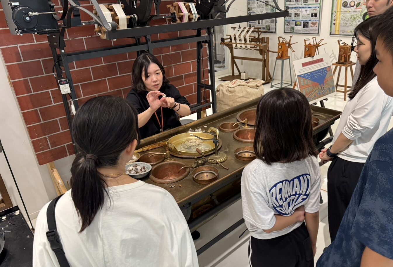 当館の体験コーナーには、実動機として「フランス式繰糸機」の復元機があります。実演イベントでは、当時の繰糸法である「共より式」によるより掛けを再現しながら、糸取りの技法などの解説を行います。