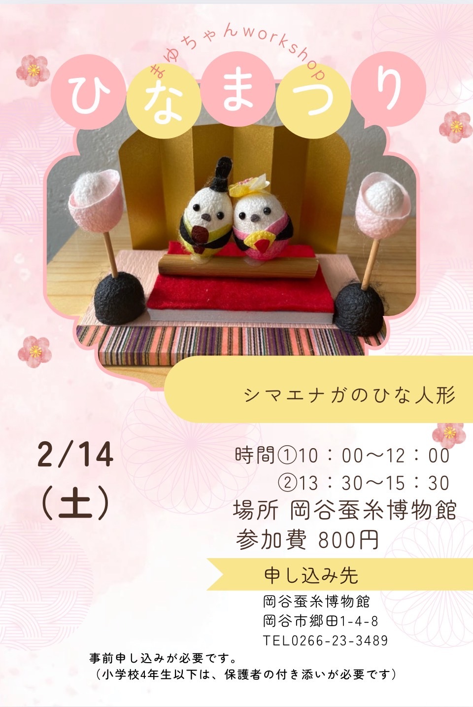 お知らせ , イベント 2/14(土)まゆちゃんワークショップ開催「シマエナガのひな人形」 2026.01.29 お知らせ , イベント 【まゆちゃんワークショップ開催のお知らせ】 2/14(土) ①午前10時~12時 ②午後1時30分~3時30分 まゆちゃん工房でボランティアをしていただいている、クラフトアシスタントの皆さんによるワークショップを開催します。 今回は「シマエナガのひな人形」です。 Tweet 2/11(水・祝)銀座NAGANOにて「感じてみよう!シルクの魅力」開催 前の記事 2/19(木)~5/24(日) 企画展 諏訪のものづくりⅢ「製糸業と味噌醸造業~工女さんの食生活」開催 次の記事 新着のお知らせ 2/19(木)~5/24(日) 企画展 諏訪のものづくりⅢ「製糸業と味噌醸造業~工女さんの食生活」開催 2026.01.31 2/11(水・祝)銀座NAGANOにて「感じてみよう!シルクの魅力」開催 2026.01.29 まゆちゃん工房2月の営業日 2026.01.29