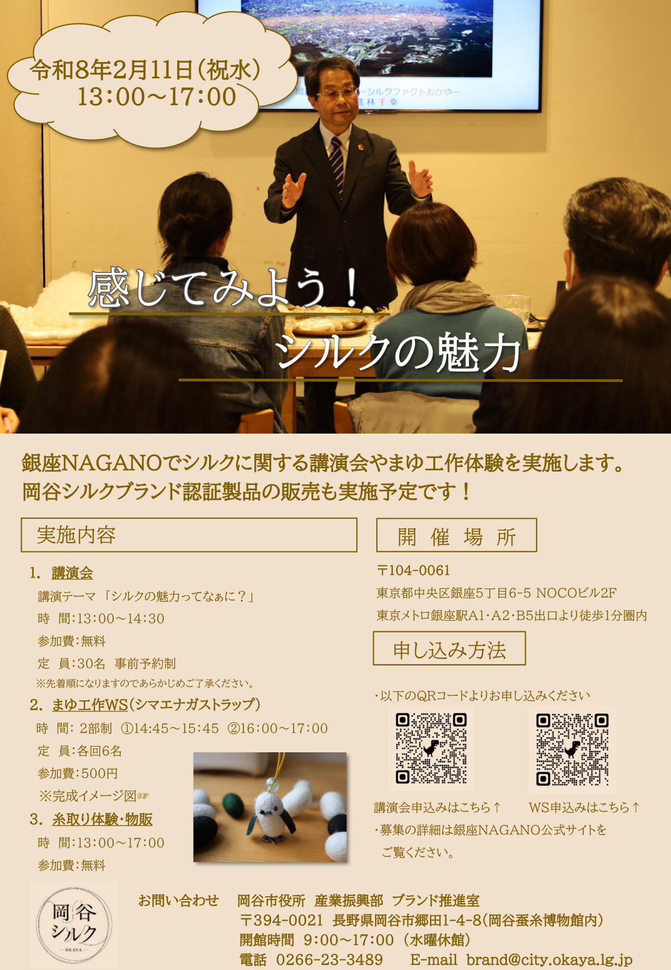 2/11(水・祝)に銀座NAGANO(東京都中央区銀座5-6-5 NOCOビル2F)でシルクのイベントを開催します。髙林館長による講演会や糸取り体験、まゆを使用してシマエナガのストラップを作成するワークショップ、シルク製品の物販を行います。見て、聞いて、体験していただき、シルクの魅力を感じてください!